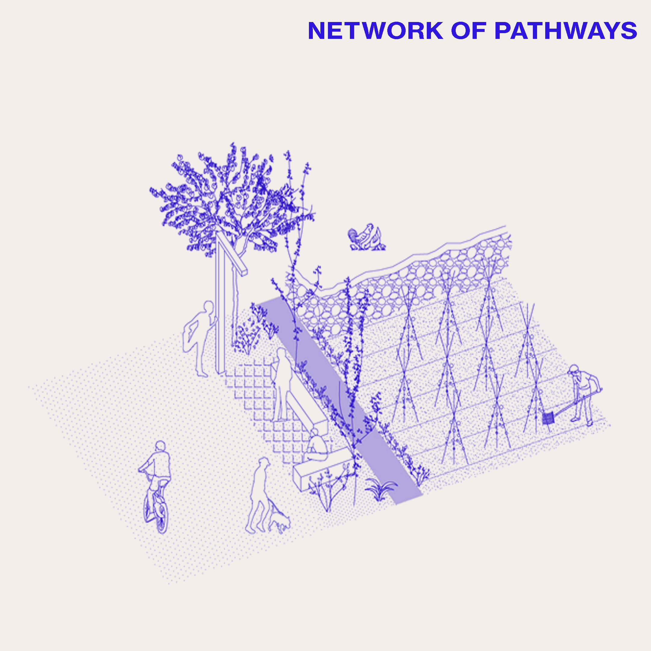 Es proposa un espai públic productiu, un mosaic de petits horts optimitzant l'orografia del terreny i els murs de pedra seca, testimoni valuós de la relació ancestral dels habitants amb el territori. Un eix central organitza el recorregut entre les àrees naturals i el centre de la ciutat, mentre que els camins existents transversals es condicionen per allotjar-hi activitats dinàmiques. Complementant l'estructura de camins, es proposa un espai per a usos més estàtics amb relació a Can Tomeu.