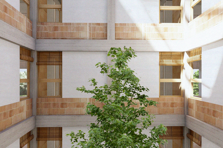 Al voltant de cada atri s'organitzen dos habitatges que compten amb espais equilibrats -tots ells de més de 10 m2- promovent així la no-jerarquització d'aquests espais i la seva autonomia espacial. La cuina i el bany s'agrupen a l'espai central, aprofitant al màxim els plànols de façana i l'atri, de manera que tots els espais autònoms tinguin ventilació creuada i condicions òptimes d'il·luminació.