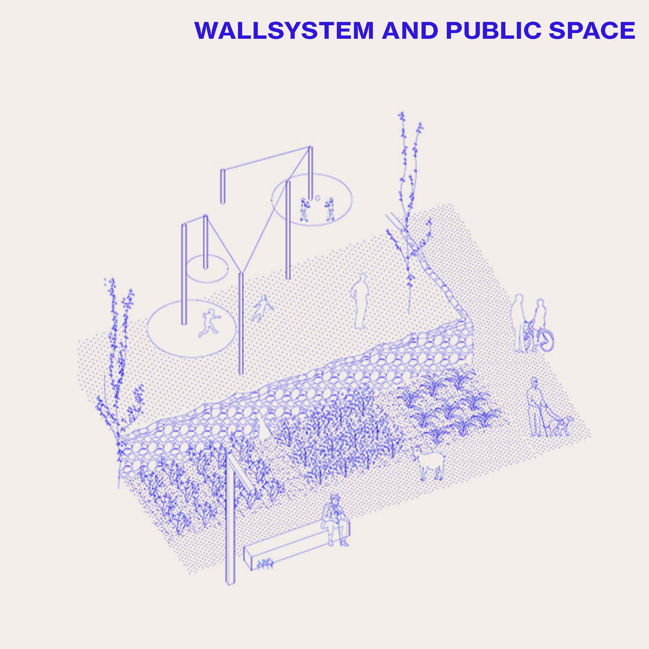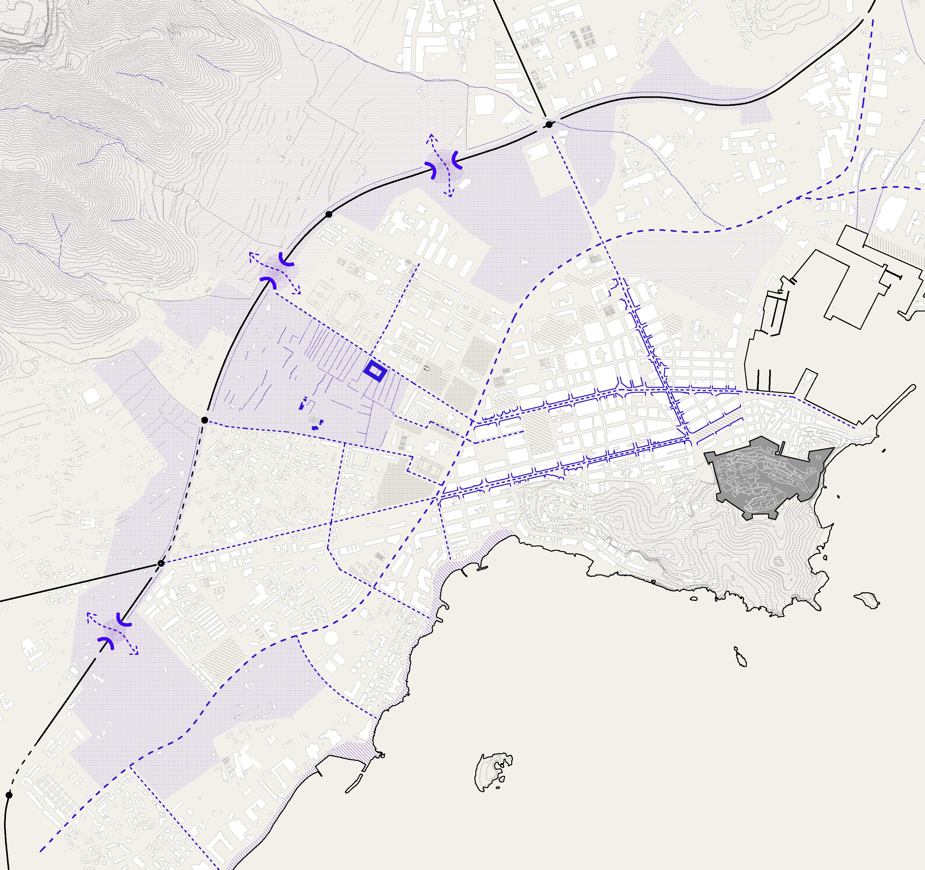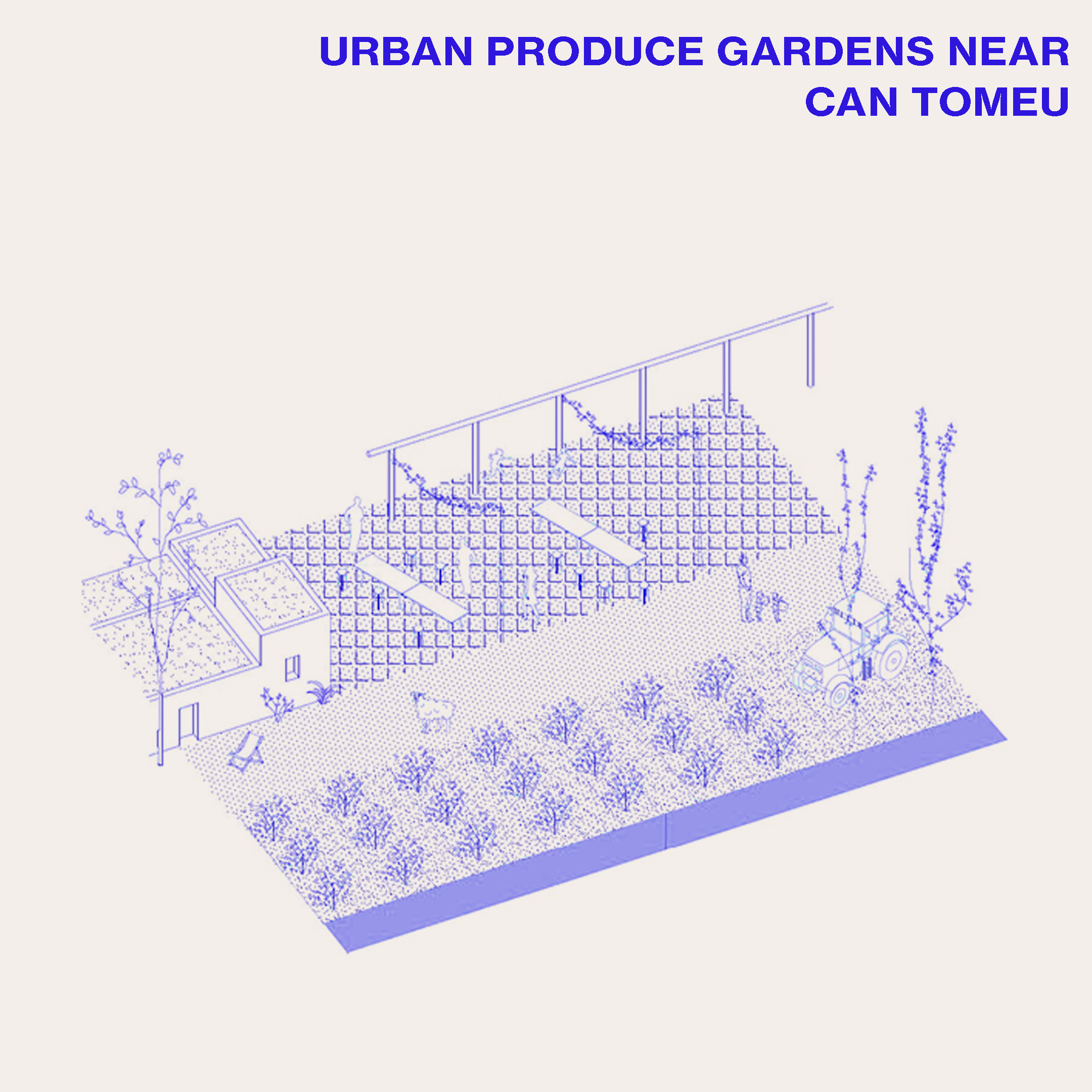 Se propone un espacio público productivo, un mosaico de pequeños huertos optimizando la orografía del terreno y los muros de piedra seca, valioso testimonio de la relación ancestral de los habitantes con el territorio. Un eje central organiza el recorrido entre las áreas naturales y el centro de la ciudad, mientras que los caminos existentes transversales se condicionan para alojar actividades dinámicas. Complementando la estructura de caminos, se propone un espacio para usos más estáticos en relación con Can Tomeu.