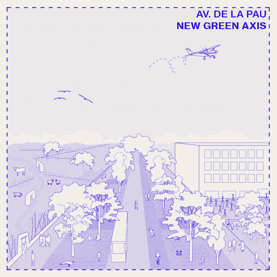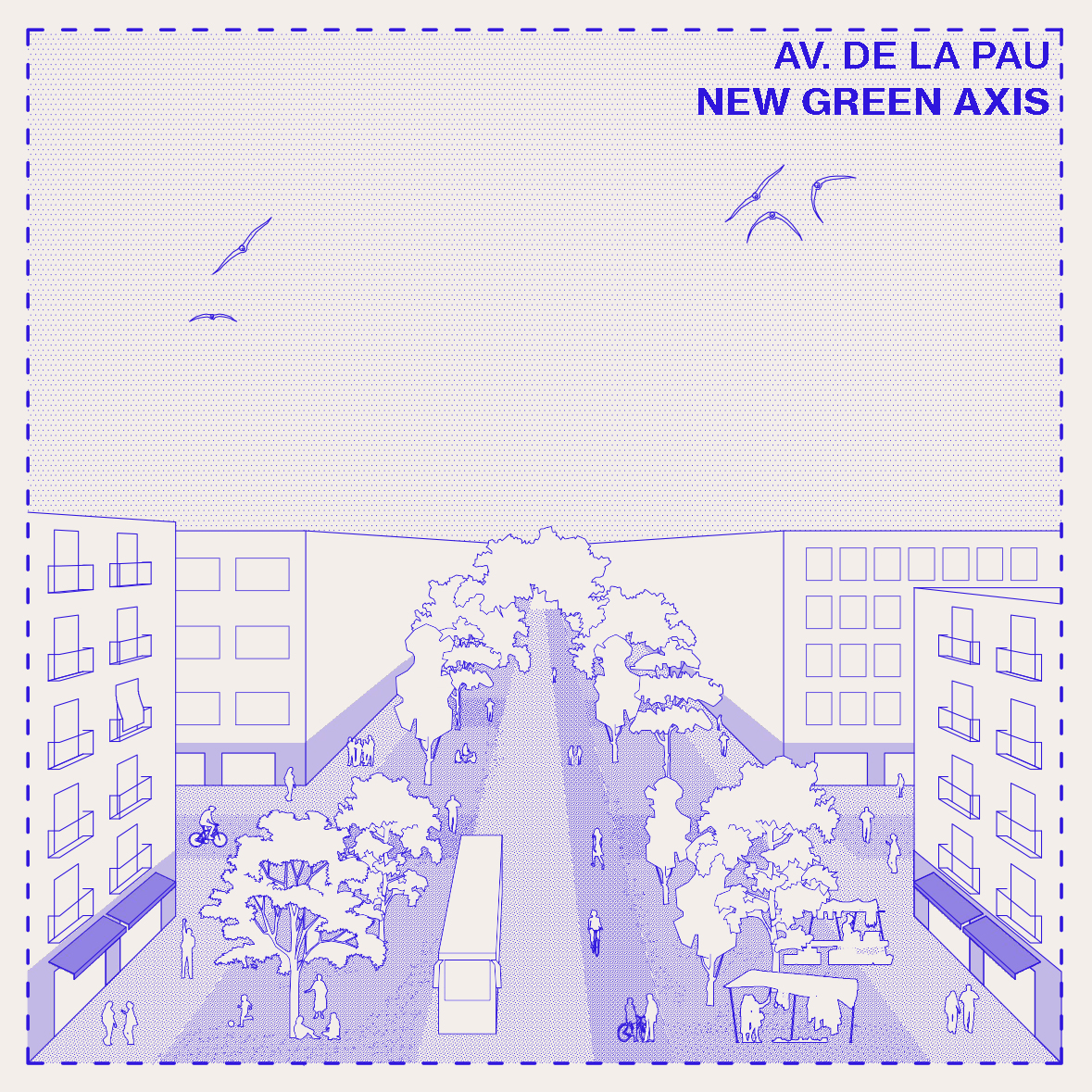 A escala urbana, proponemos la pacificación de la Avenida de la Pau – complementada con la colocación estratégica de aparcamientos disuasorios- y la reconexión del centro de la ciudad con su entorno natural.