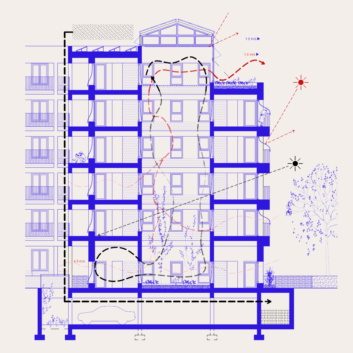 El edificio de viviendas es complejo y versátil. Su planta baja aloja gran diversidad de usos mientras se ofrece una gran variedad tipológica de viviendas, todas ellas con unas condiciones de confort excepcionales, gracias a la colocación de un atrio que supone la principal estrategia pasiva de control climático. El atrio modera las condiciones térmicas y higrométricas del edificio, manteniendo unas condiciones climáticas idóneas a lo largo de todo el año.
